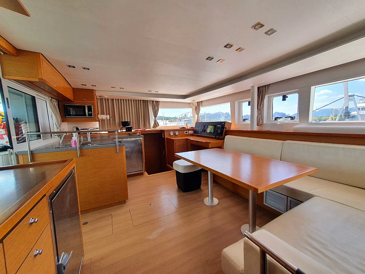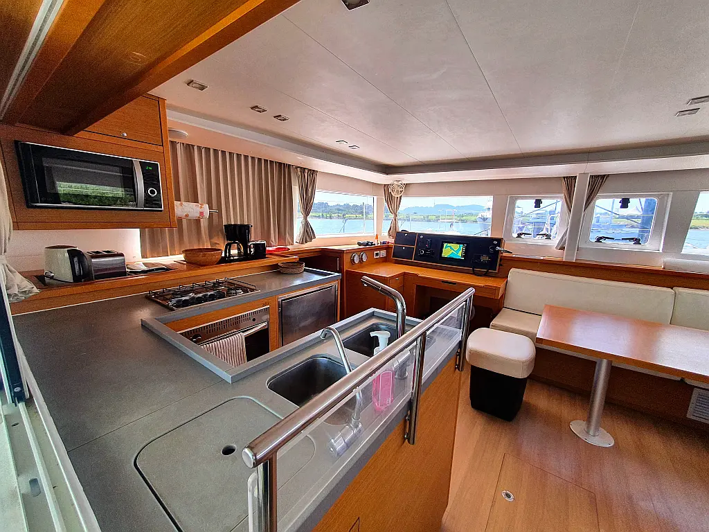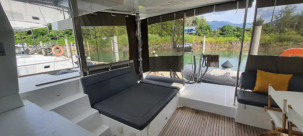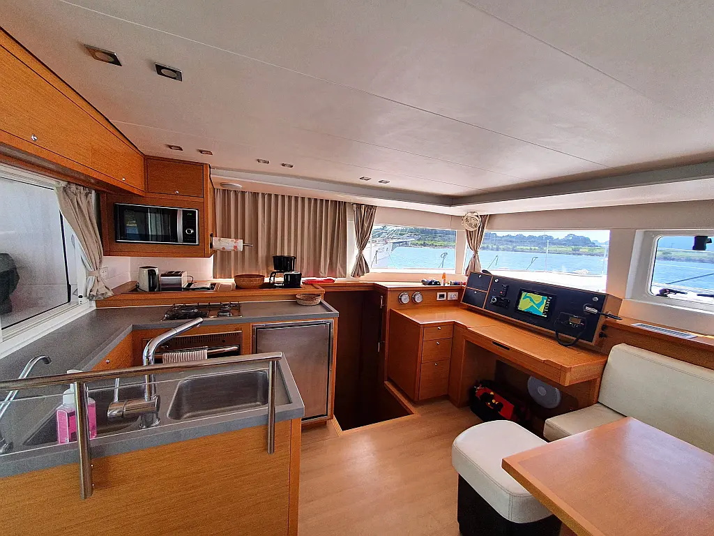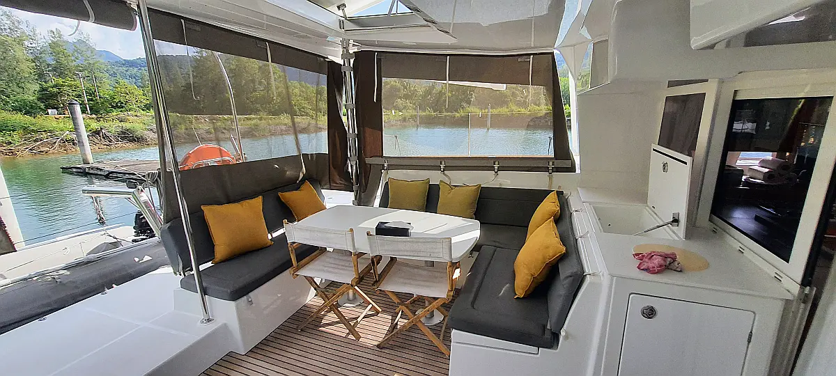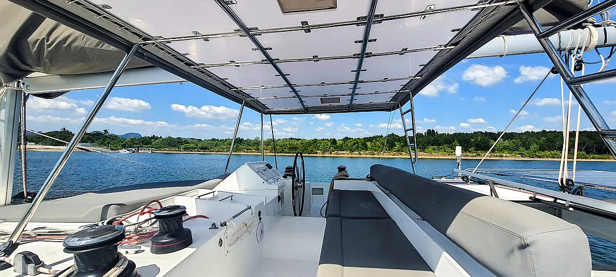 Lautsprecher im Cockpit, Wassermacher, Klimaanlage, Bimini, Kühlschrank, Generator, Solar-Panele, Außenbordmotor, Beiboot, Grill im Cockpit