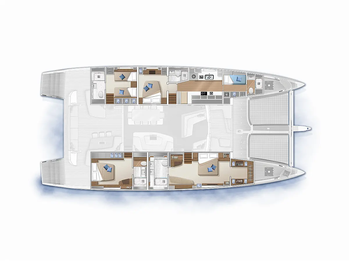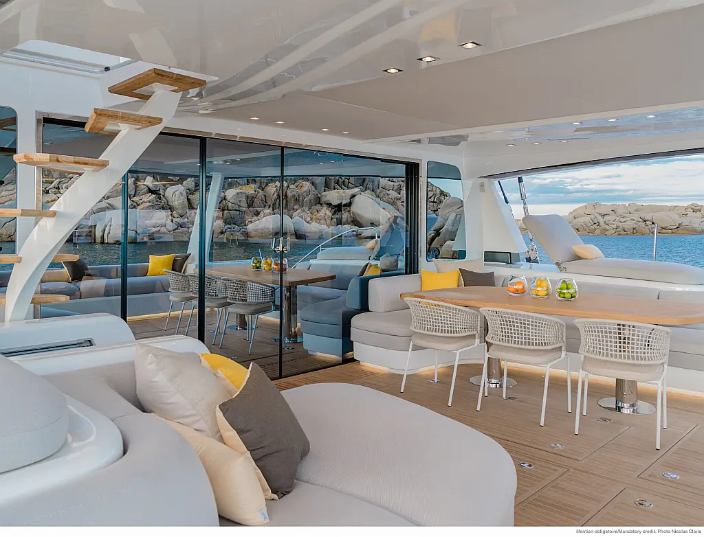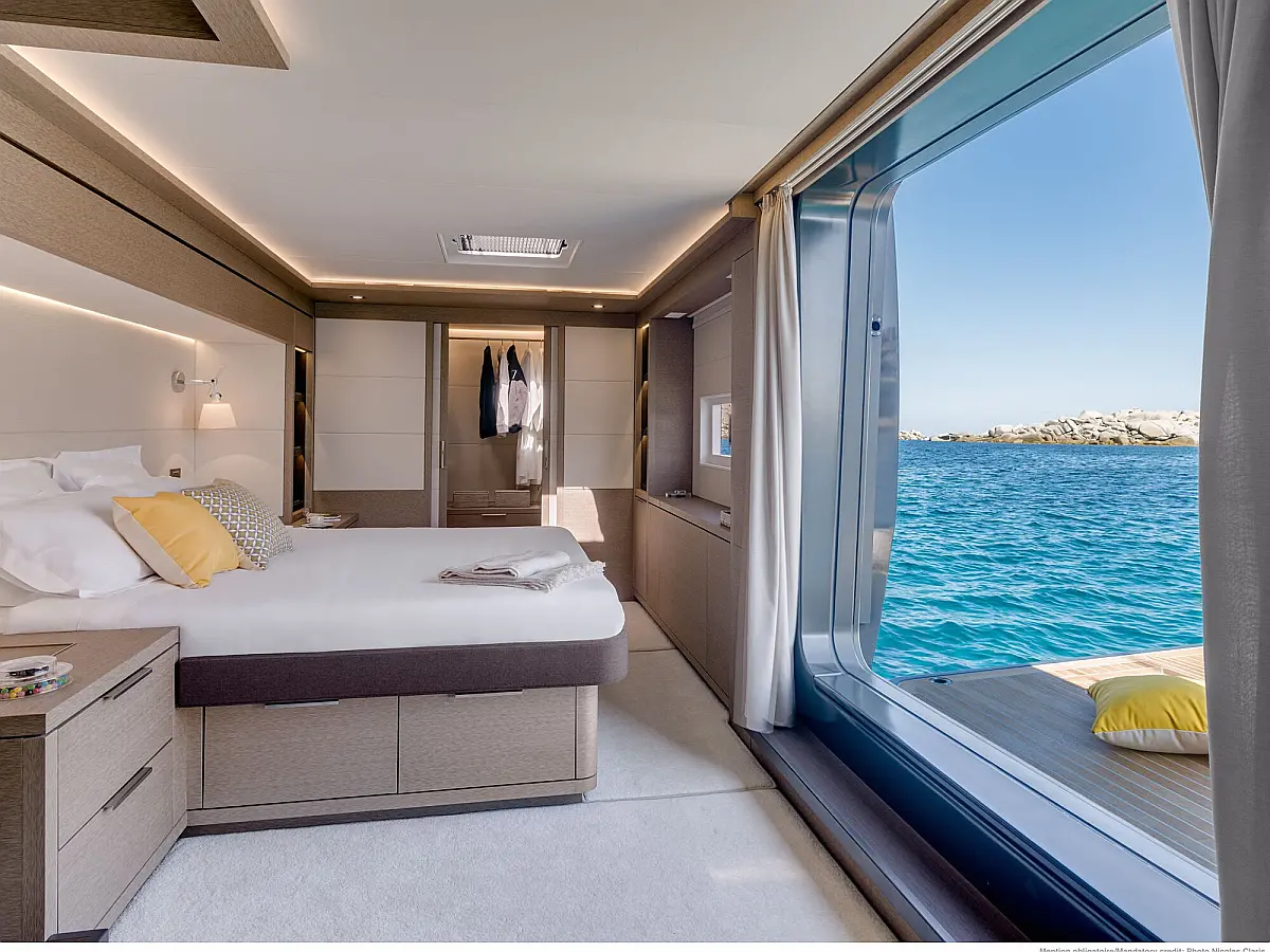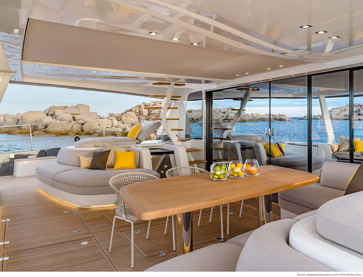 Air condition, Refrigerator, Water maker, Bimini, Cockpit speakers, Dinghy, Outboard engine, Flybridge, Teak deck, Inverter
