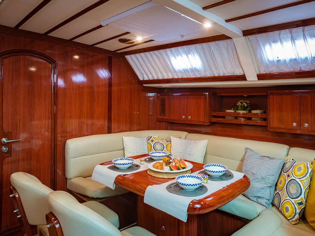 Generator, Air condition, Teak deck, Ice maker, Sprayhood, Refrigerator, Cockpit speakers, Dinghy, Bimini, Outboard engine, Water maker