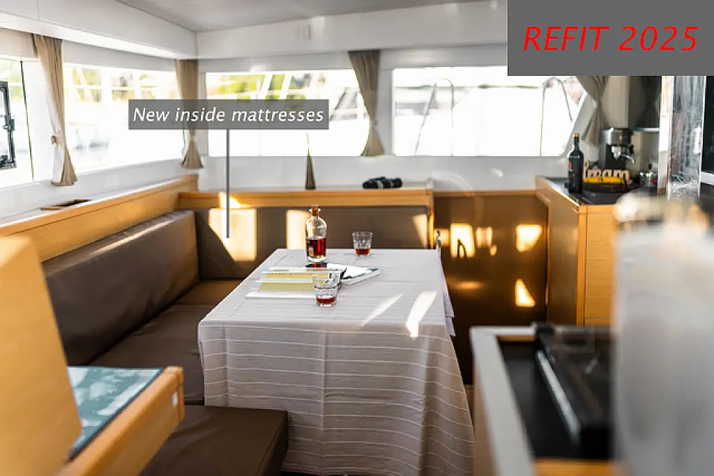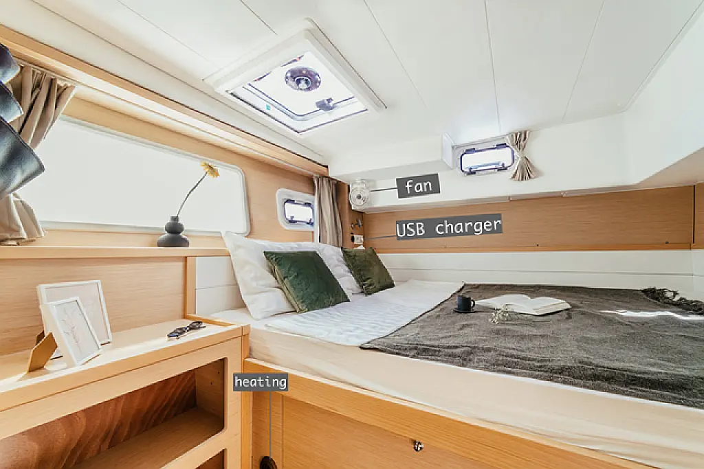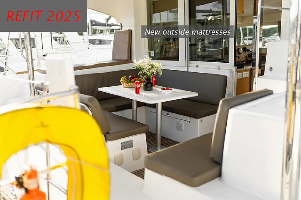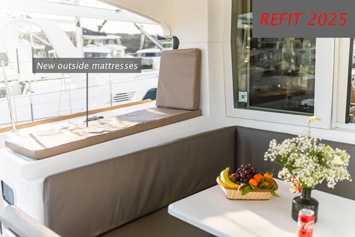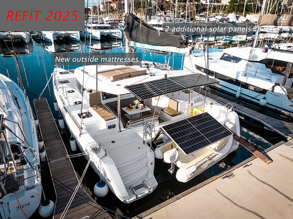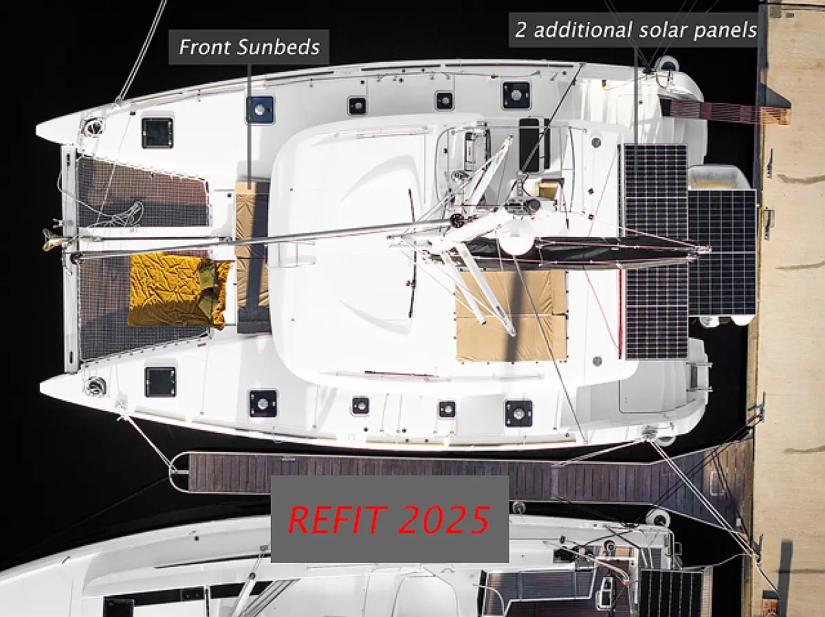 Air condition, Coffee maker, Cockpit cushions, Dinghy, Electric winches, Electric toilet, Ice maker, Holding tank, Inverter, Bimini, Solar Panels, Sprayhood, Teak Cockpit, Heating